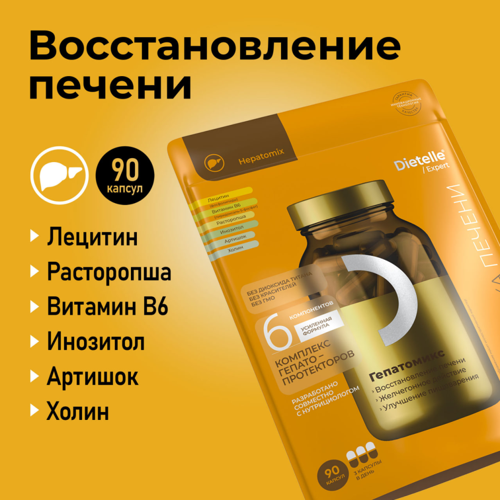 Если ваш день непредсказуем или очень насыщен, Dietelle Expert Hepatomix станет надежным союзником вашей печени – гепатопротектор, способствующий восстановлению печени и улучшению работы желчевыводящих путей благодаря уникальной формуле из 6 компонентов, действующих синергично.
