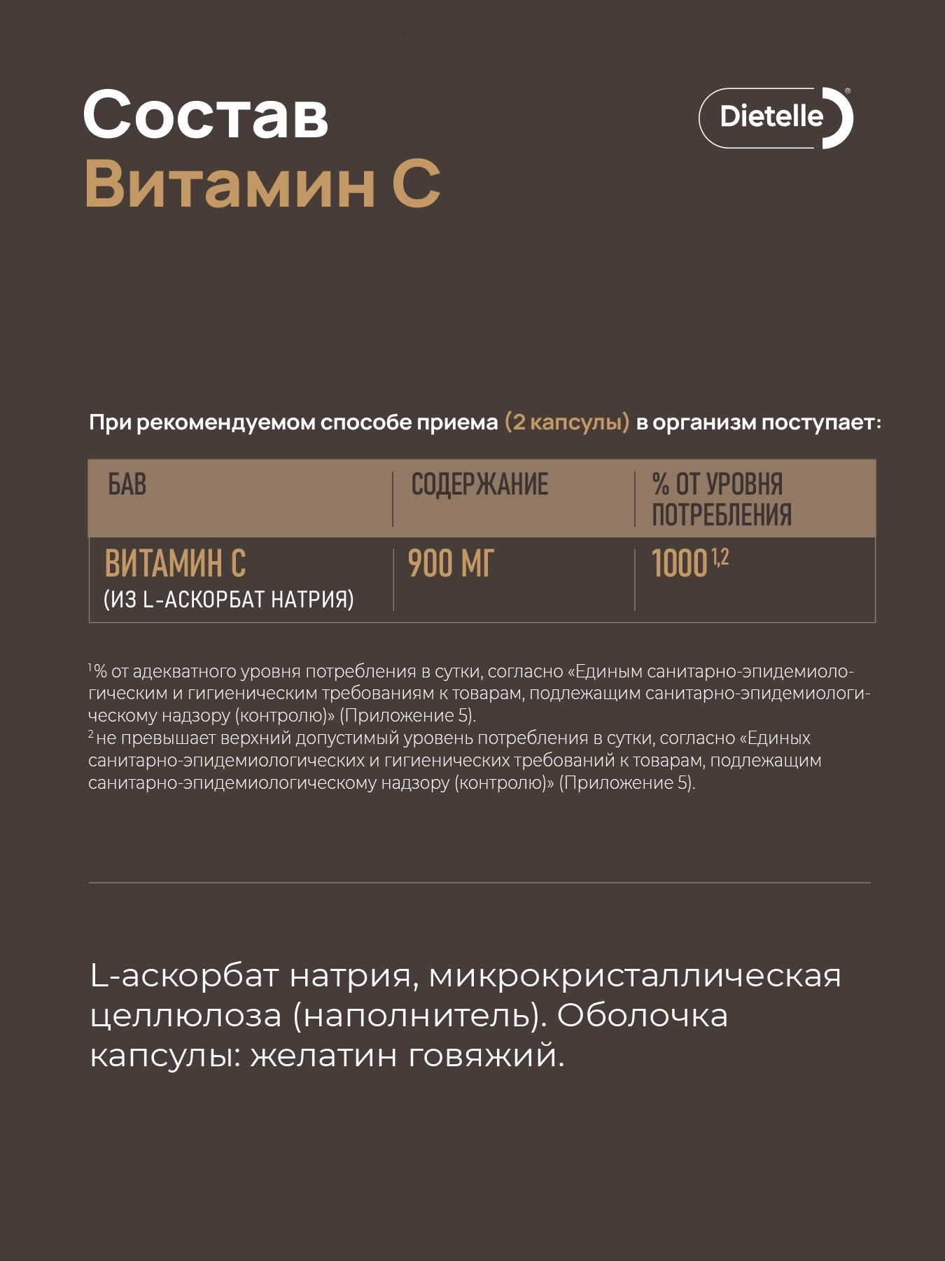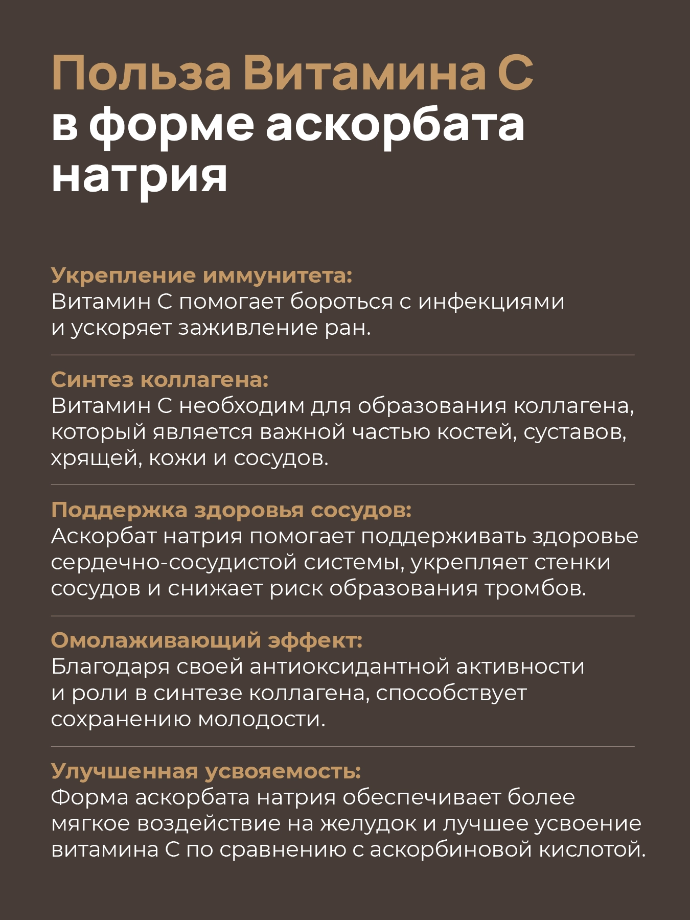 Витамин С в форме L-аскорбат натрия — имеет те же самые свойства, что и аскорбиновая кислота, но при этом обладает нейтральной кислотностью, благодаря чему не раздражает слизистую желудка.