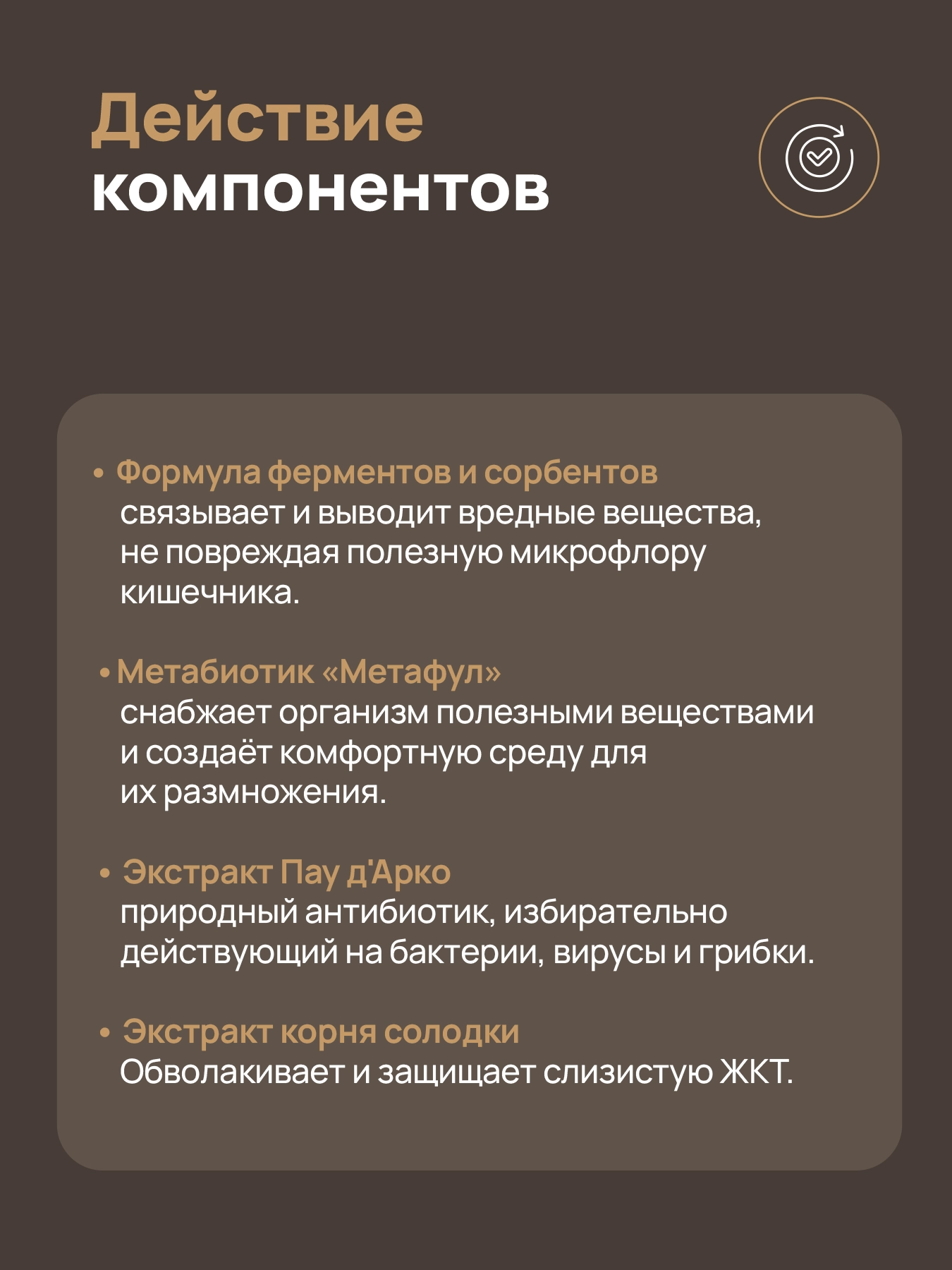 Сочетает действие метабиотика, сорбента и природного иммуномодулятора. Метабиотики разрушают биопленки бактерий и грибов. Экстракт Пау д’Арко оказывает противогрибковый, антибактериальный, противовирусный, противопаразитарный эффекты.