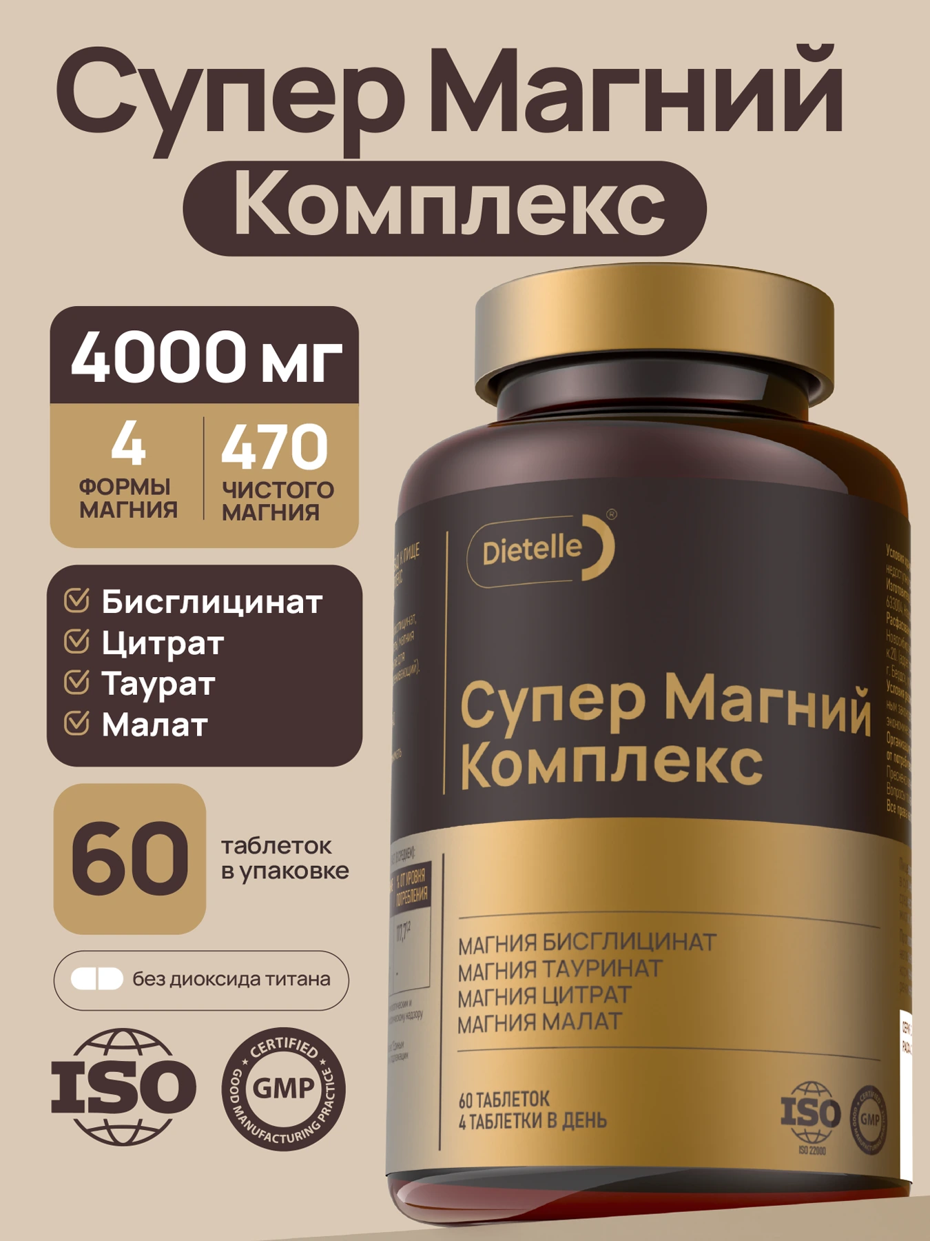 DIETELLE Супер Магний — это синергетический комплекс из 4 биодоступных форм магния, каждая из которых работает на своём уровне, обеспечивая комплексное восстановление: