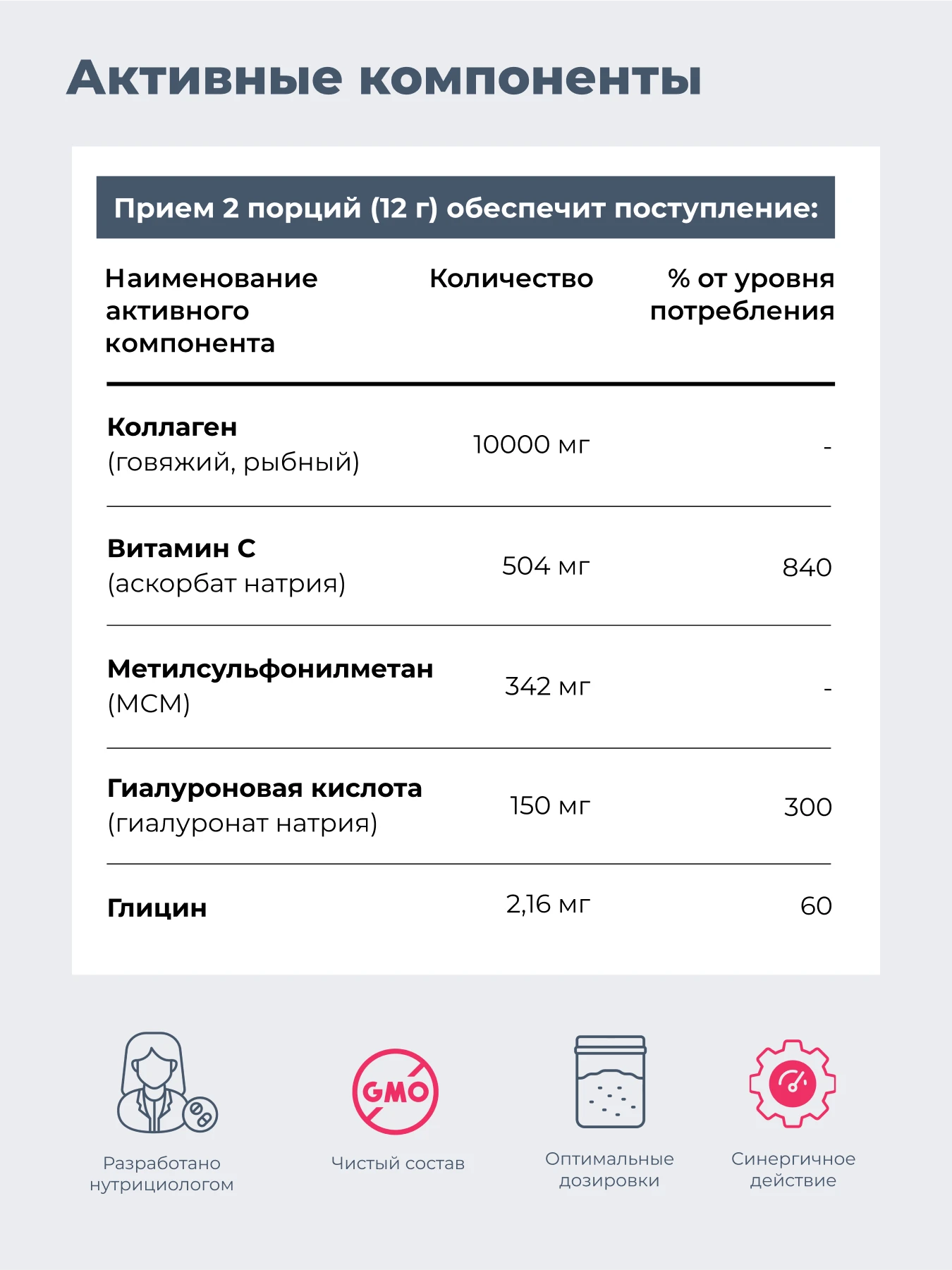Коллаген Микс включает два вида коллагена (рыбный и говяжий), гиалуроновую кислоту, витамин С и MSM. Высокая дозировка обеспечивает увлажнение кожи, улучшает её эластичность и стимулирует выработку собственного коллагена.