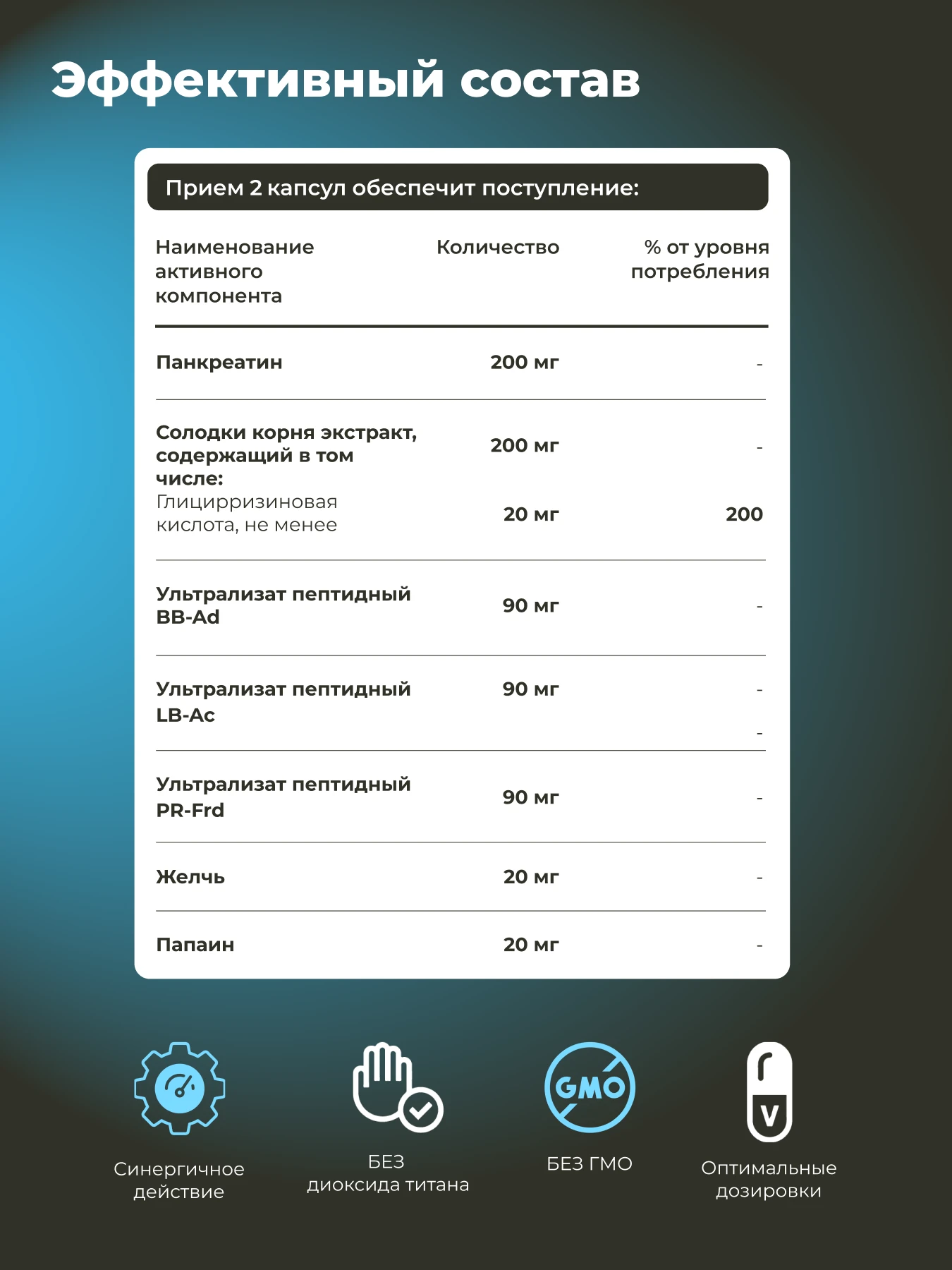 Комплекс пищеварительных ферментов, которые улучшают пищеварение и снижают нагрузку на печень. Панкреатин, желчь, папаин и другие компоненты в составе помогают расщеплять жиры, белки и углеводы, облегчая функцию печени. Пептидные ультрализаты восстанавливают микробиоту кишечника и помогают устранять метеоризм, вздутие и тяжесть в желудке.
