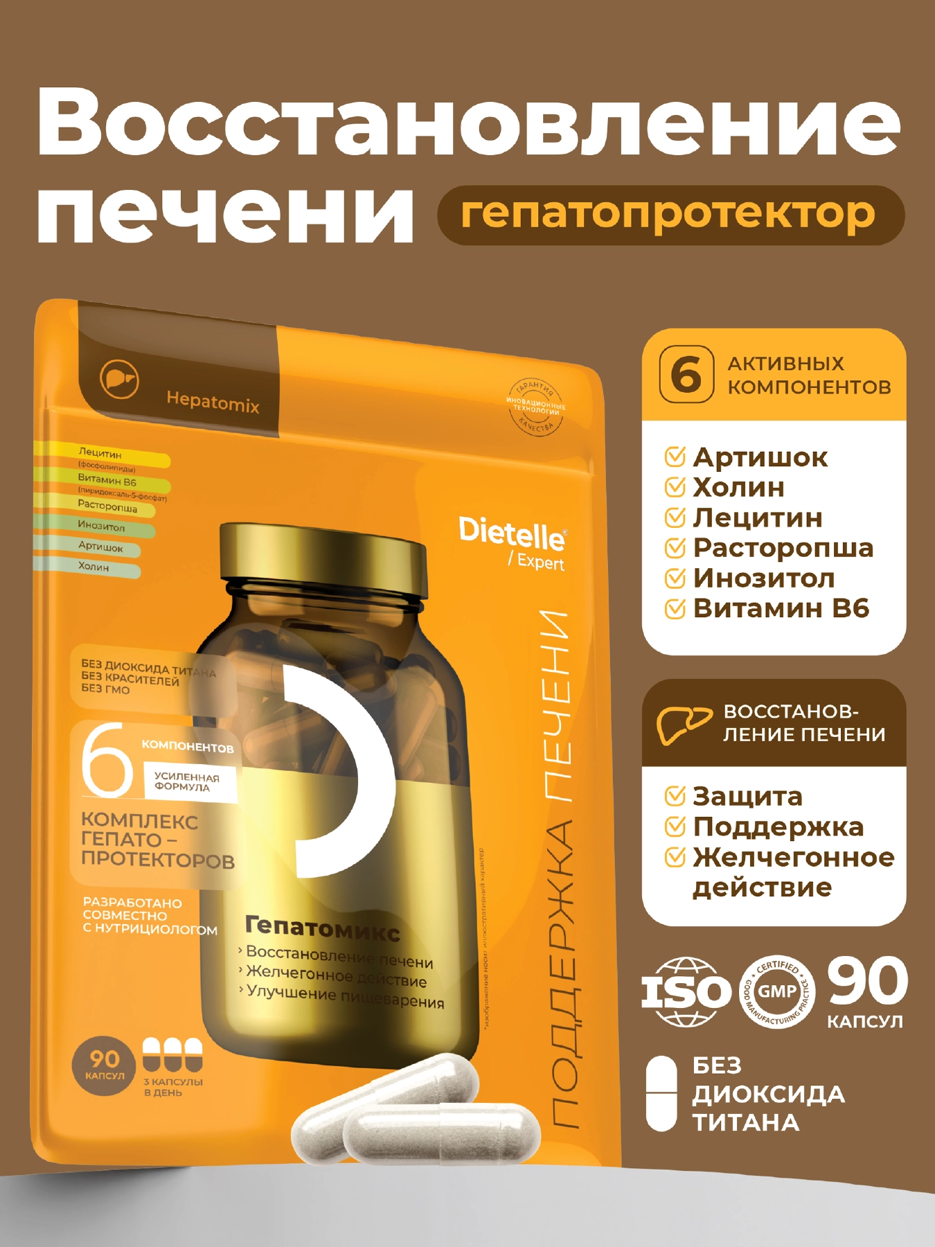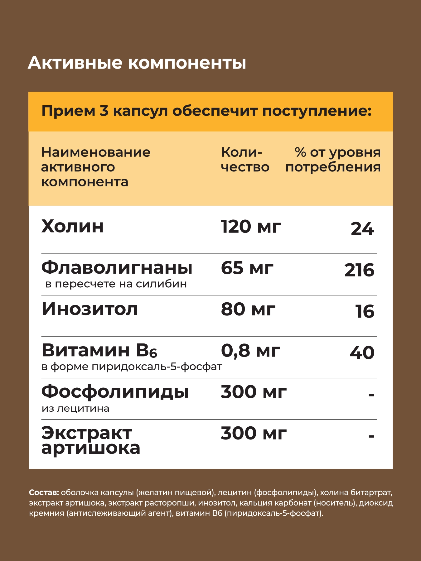 Восстанавливает функции печени и улучшает работу желчевыводящих путей. Лецитин в составе помогает улучшить функциональное состояние печени и вывод токсинов, экстракт артишока стимулирует образование желчи, расторопша защищает клетки печени. Активная форма витамина B6 и холин участвуют в метаболических процессах, а холин и инозитол улучшают функцию печени и предотвращают образование желчных камней.