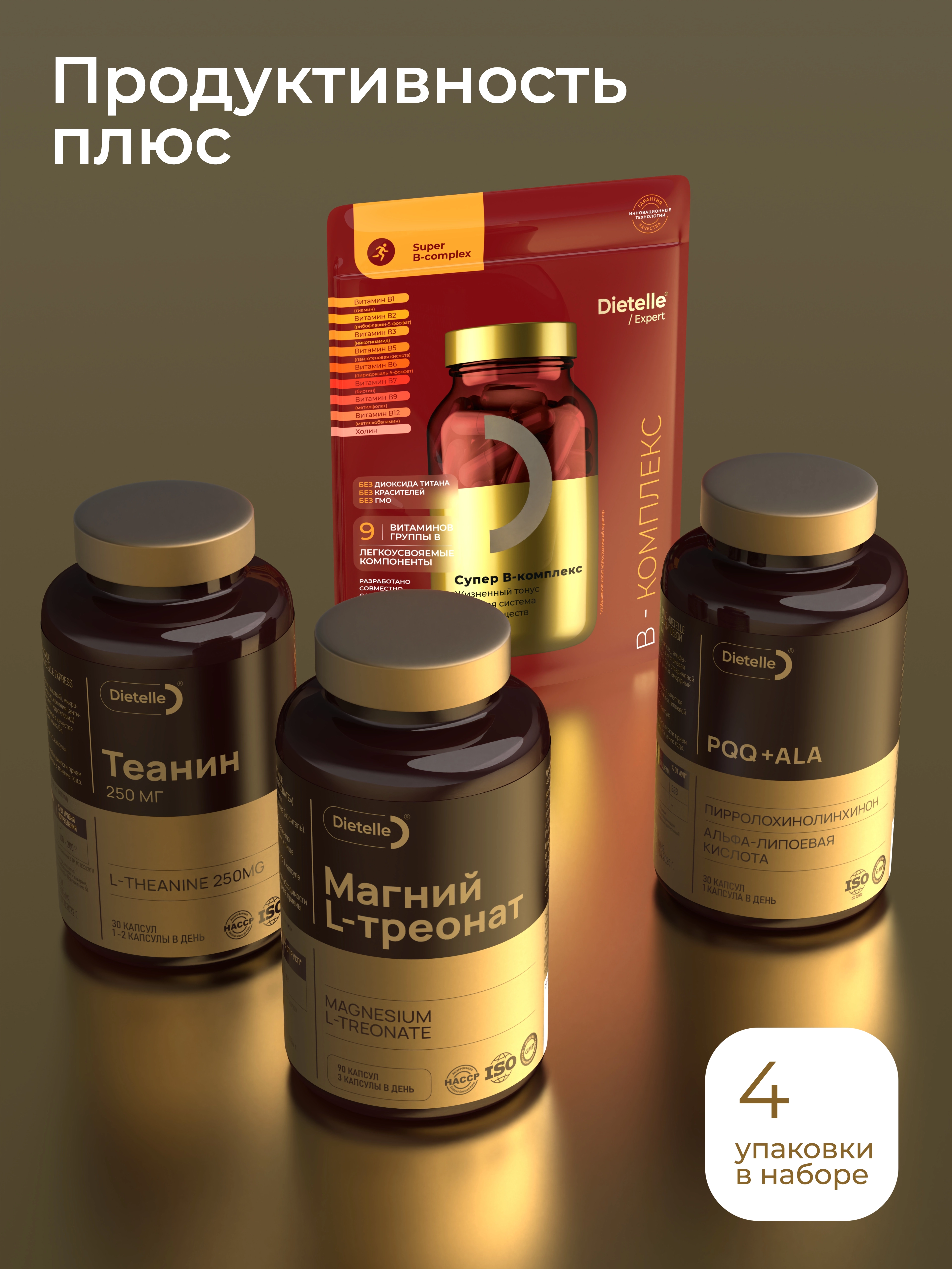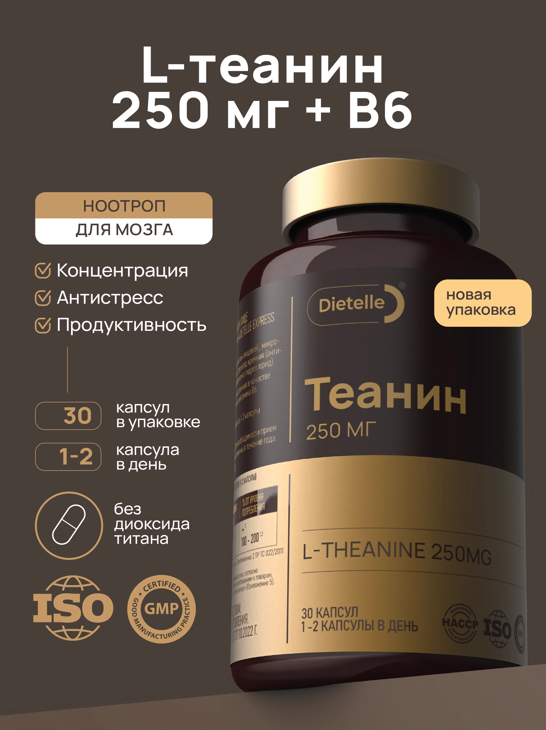 Снижает уровень стресса и тревожности, улучшает память и концентрацию внимания. L-теанин, аминокислота из зеленого чая, синергетически работает с витамином B6, оптимизируя работу нейротрансмиттеров. Теанин способствует выработке альфа-волн в мозге, что создаёт состояние спокойной сосредоточенности.